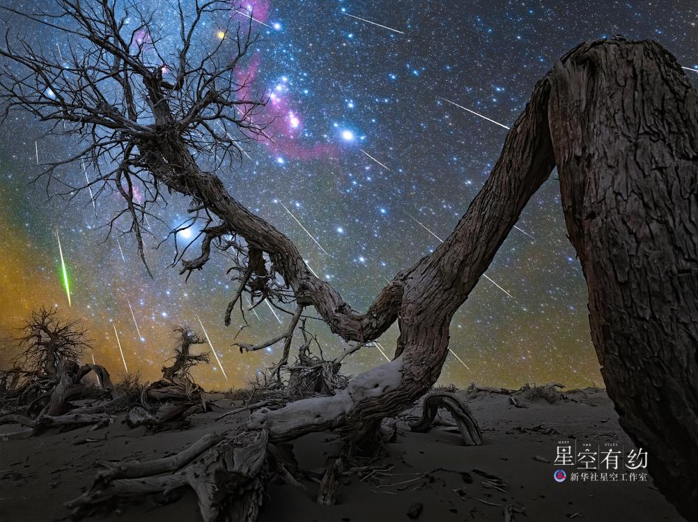 甘肅星空攝影愛好者王添瑋2020年12月13日在內蒙古額濟納旗怪樹林景區拍攝的雙子座流星雨(多張疊加)。(本人供圖)