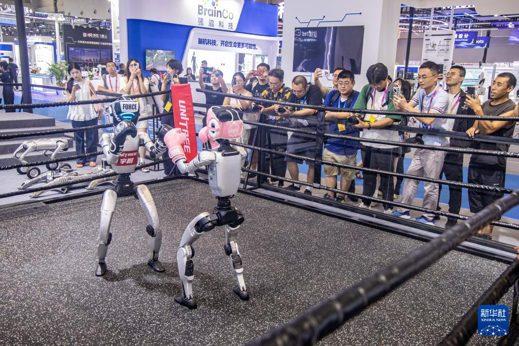 这是9月4日在2025世界智能产业博览会宇树科技展厅拍摄的机器人拳击赛现场。