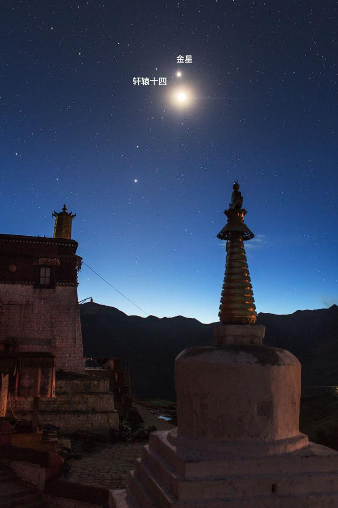 这是在西藏甘丹寺拍摄的金星、轩辕十四和月亮。(资料图片,戴建峰 摄)