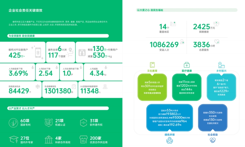 因责任散发温情,从善意到善行。正是肩负着全民健康的企业社会责任,瘦吧科技始终从心出发,将善意化为实实在在的行动。企业及其基金会--中食安泓爱心公益基金会积极在医疗健康、文化教育、绿色环保、社会救助、乡村振兴五大领域开展超过20多项公益行动,累计向社会捐赠超过2425万元,超过108万人受益。