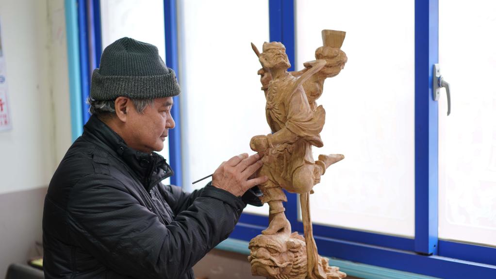 臺灣彰化鹿港的木雕匠人李秉圭為一尊木雕造像修飾細節(2月3日攝)。新華社記者 黃揚 攝