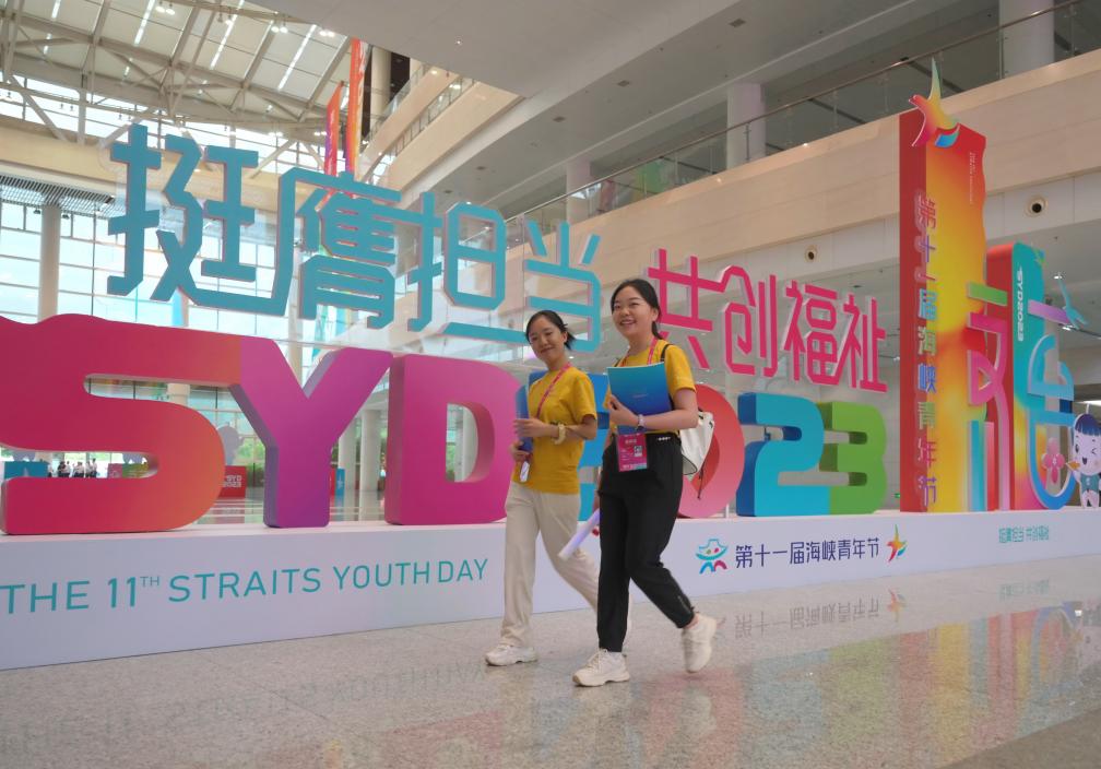 8月10日,青年代表從第十一屆海峽青年節宣傳欄前走過。新華社記者 林善傳 攝