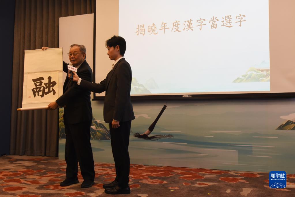 12月8日,由兩岸有關(guān)機(jī)構(gòu)共同主辦的2023海峽兩岸年度漢字評(píng)選結(jié)果在臺(tái)北揭曉,“融”字以最高票當(dāng)選。這是臺(tái)灣中華書(shū)學(xué)會(huì)會(huì)長(zhǎng)張炳煌(左)揭曉年度漢字。新華社記者 劉斐 攝