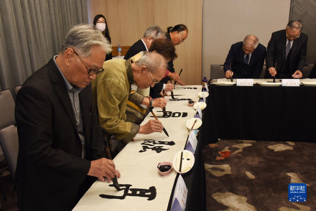評(píng)選結(jié)果揭曉后,來(lái)自臺(tái)灣中華書(shū)學(xué)會(huì)的多位書(shū)法家和參會(huì)嘉賓現(xiàn)場(chǎng)潑墨揮毫,以多種字體在長(zhǎng)卷上共同書(shū)寫(xiě)“融”字。