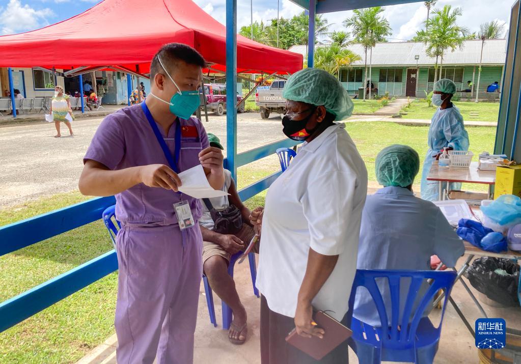 2021年8月25日,在巴布亞新幾內(nèi)亞新愛爾蘭省卡維恩總醫(yī)院,中國援巴新醫(yī)療隊隊員向當(dāng)?shù)蒯t(yī)護人員介紹疫苗接種注意事項。新華社發(fā)(中國援巴新醫(yī)療隊供圖)