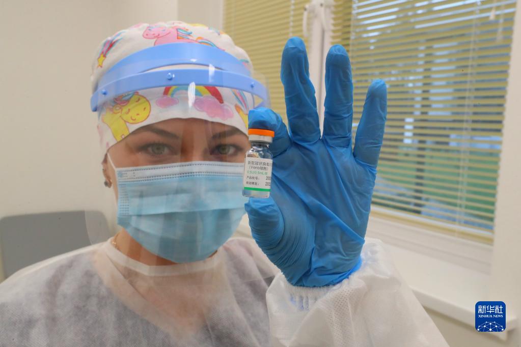 2021年4月16日,在白俄羅斯首都明斯克郊區(qū)的中白工業(yè)園,醫(yī)務(wù)人員展示中國國藥集團生產(chǎn)的新冠疫苗。當(dāng)日,中白工業(yè)園開發(fā)公司、管委會及部分居民企業(yè)的員工開始接種中國政府援助白俄羅斯的新冠疫苗。新華社發(fā)(任科夫 攝)
