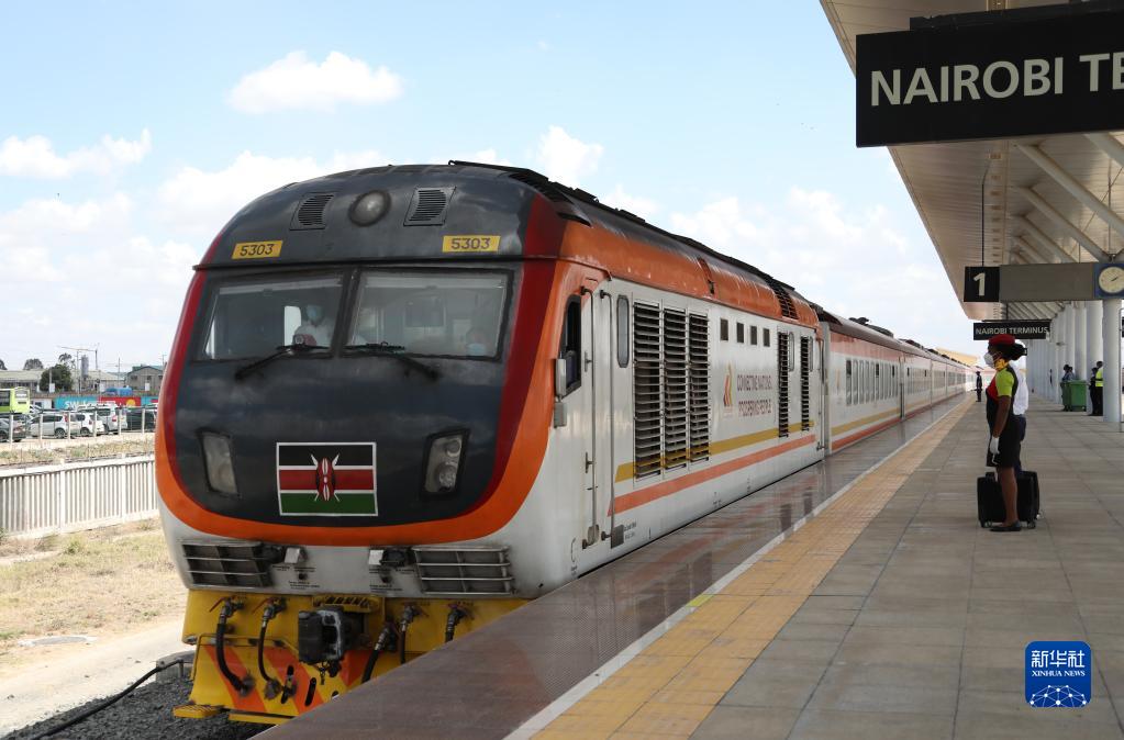 2021年11月17日,由蒙巴薩始發(fā)的蒙內(nèi)鐵路客運列車駛?cè)肟夏醽唭?nèi)羅畢站。蒙內(nèi)鐵路連接?xùn)|非第一大港口蒙巴薩和肯首都內(nèi)羅畢,于2017年5月31日開通。新華社記者 董江輝 攝
