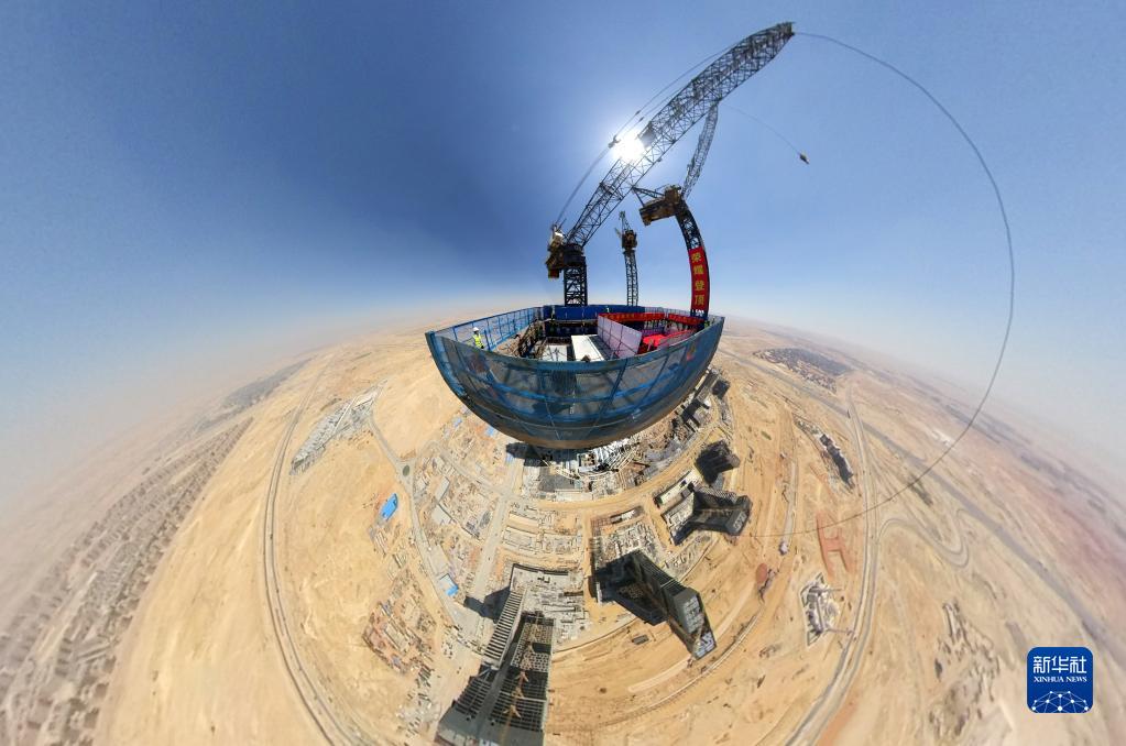 這是2021年6月17日在埃及開羅附近拍攝的埃及新行政首都中央商務(wù)區(qū)標志塔(全景相機拍攝)。埃及新行政首都中央商務(wù)區(qū)位于首都開羅以東約50公里處,由中國建筑股份有限公司埃及分公司承建。新華社記者 隋先凱 攝