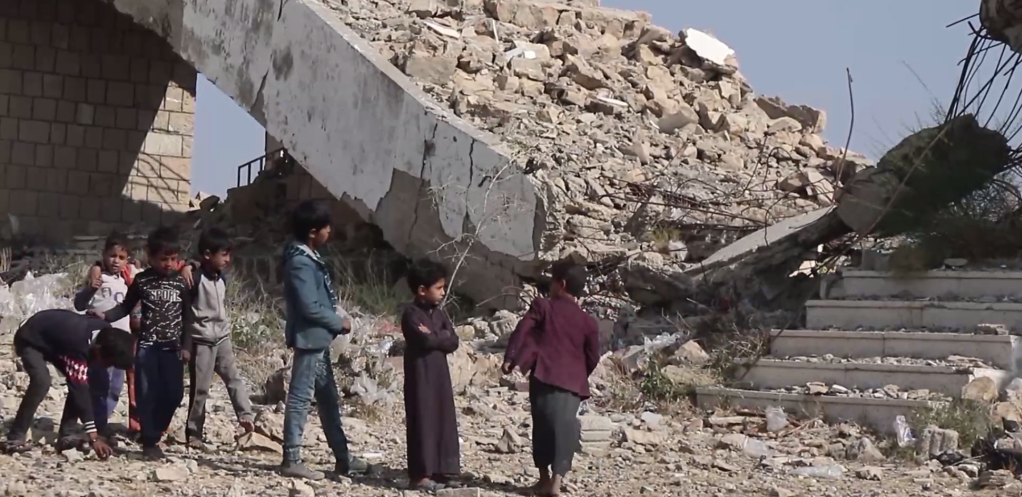 舒哈達-瓦赫達學校的學生們在廢墟中玩耍。(視頻截圖)