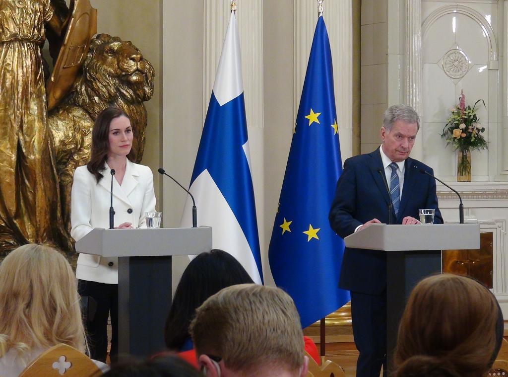 5月15日,在芬蘭赫爾辛基,芬蘭總統尼尼斯托(右)和總理馬林參加聯合記者會。新華社記者陳靜攝