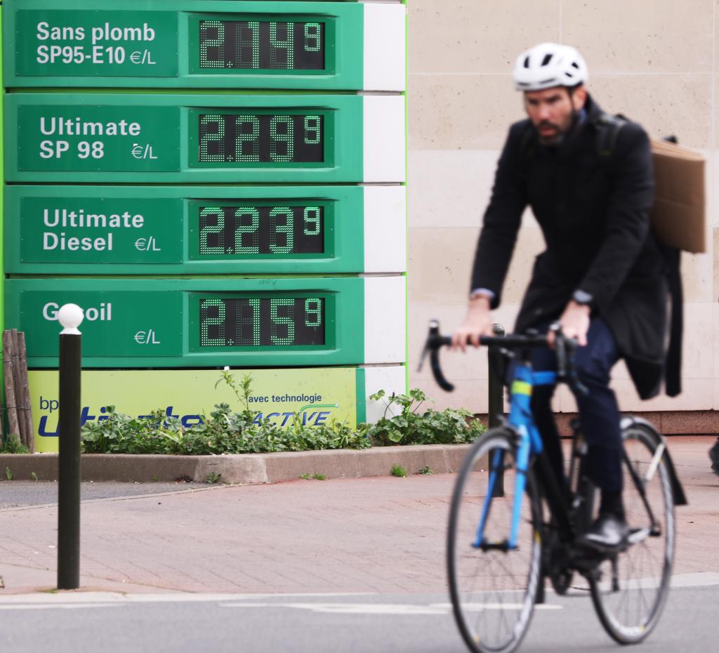 3月16日,一名男子騎車經過法國巴黎一處加油站。(新華社記者高靜攝)