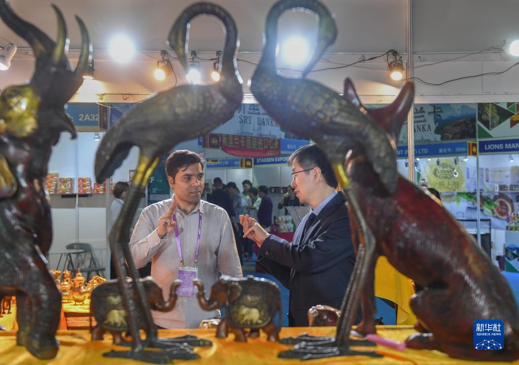 2019年4月18日,在福建泉州石獅市舉行的第五屆中國(泉州)海上絲綢之路國際品牌博覽會上,印度客商(左)向顧客推銷印度工藝品。 新華社記者 宋為偉 攝