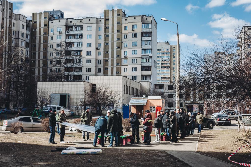 3月17日,人們?cè)跒蹩颂m基輔領(lǐng)取用來(lái)遮擋窗戶的塑料布。新華社發(fā)(迭戈·埃雷拉攝)
