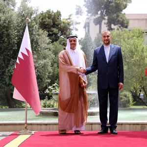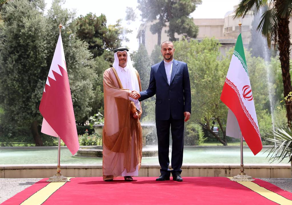 7月6日,伊朗外長阿卜杜拉希揚(右)在德黑蘭歡迎到訪的卡塔爾副首相兼外交大臣穆罕默德。(新華社發,伊朗外交部供圖