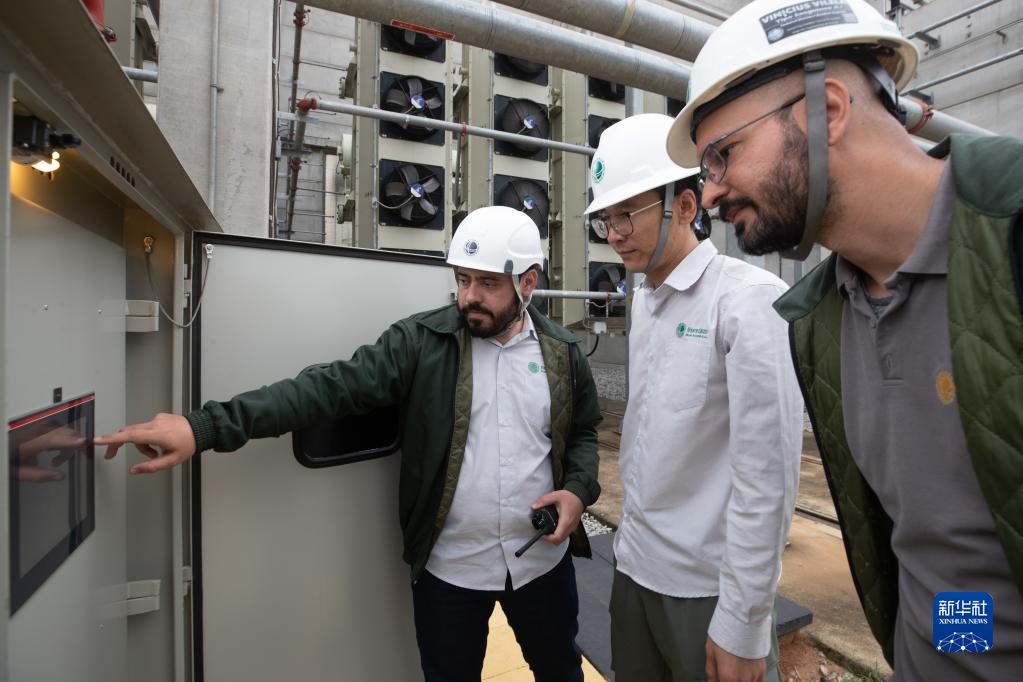 9月30日,在巴西里約熱內(nèi)盧美麗山特高壓輸電二期項目里約換流站,國網(wǎng)巴控公司換流站運(yùn)維主管許鴻飛(中)和巴方人員檢查設(shè)備運(yùn)行狀態(tài)。新華社記者 王天聰 攝