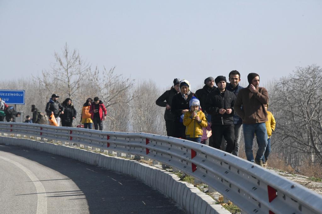 2020年3月1日,在土耳其埃迪爾內(nèi)省,難民和非法移民步行前往土耳其與希臘邊境。新華社記者徐速繪攝