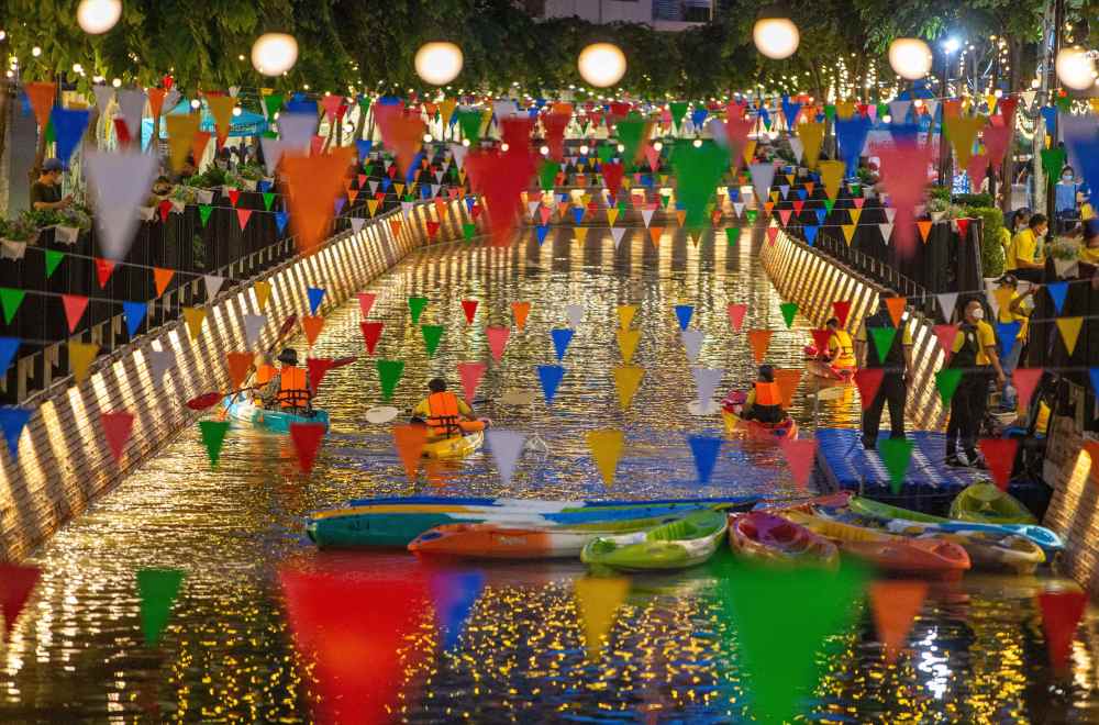 ↑2021年10月15日,游客在泰國曼谷翁昂運河步行街參加劃船活動。