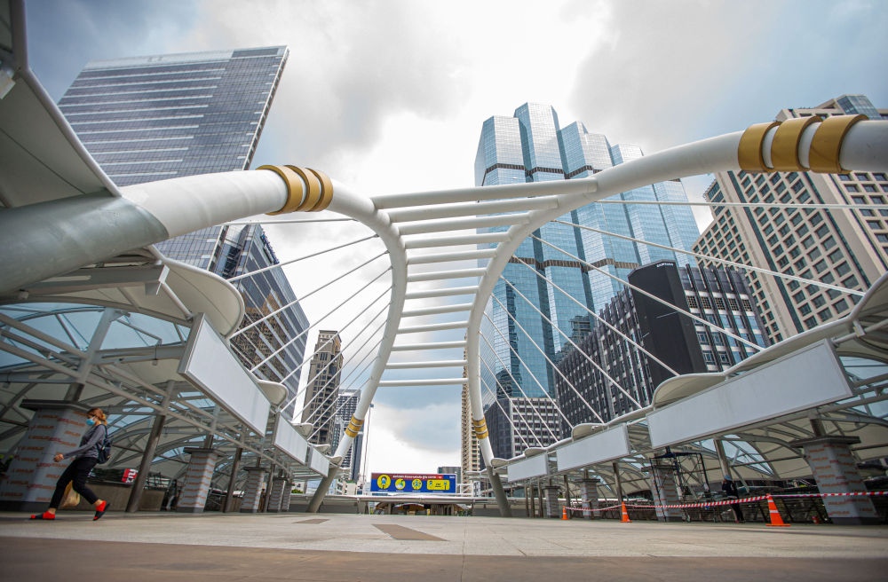 ↑2021年8月20日,在泰國曼谷,一名行人從天橋走過。