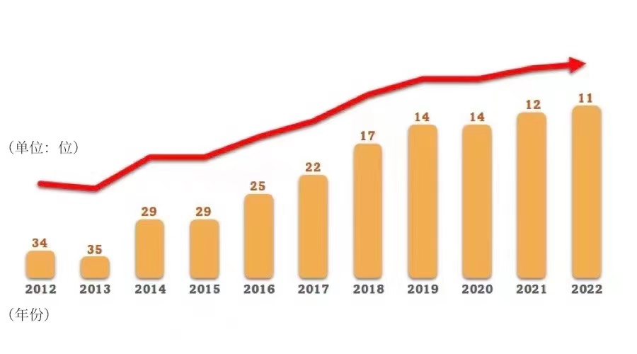 十年來,中國的全社會研發投入與國內生產總值的比例由1.91%提高到2.44%;2021年中國全社會研發經費是2012年的2.7倍,基礎研究經費是2012年的3.4倍;據世界知識產權組織發布的《全球創新指數2022》,中國排名從十年前第34名上升至第11名。