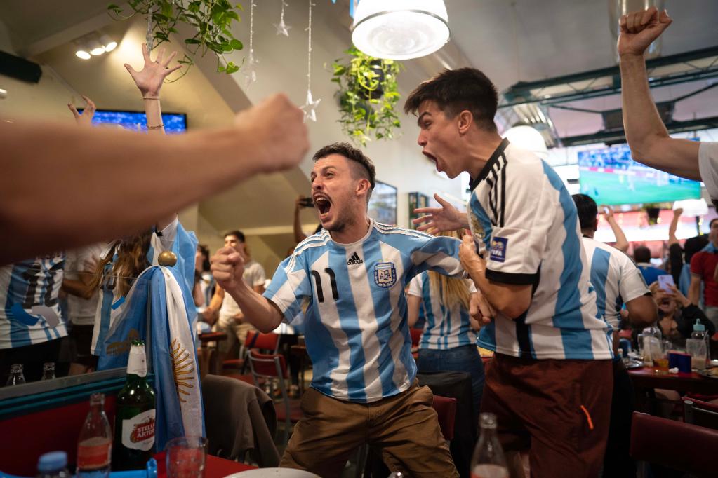 隨著比賽的進行,球迷們或歡呼,或惋惜,或慶祝,或咬緊牙關握緊拳頭盯著屏幕。每一粒進球、每一次射門,阿根廷球迷都在萬里之外,為球員們加油鼓勁,他們知道,阿根廷球迷的愛一直與在卡塔爾賽場上奔跑的阿根廷隊員在一起。