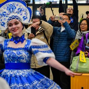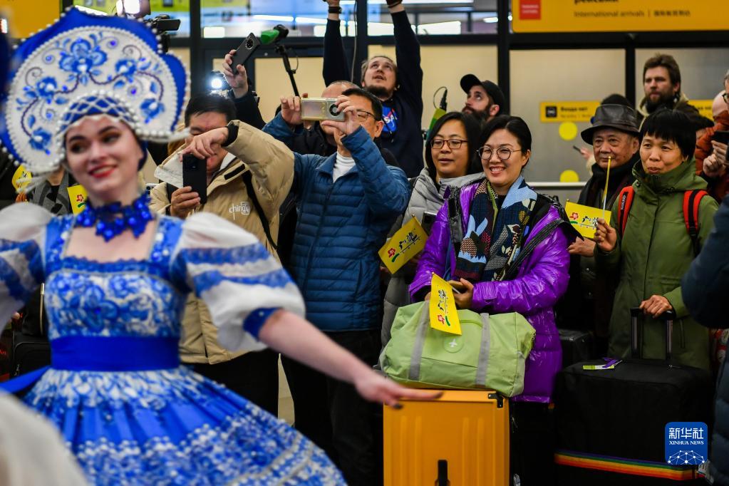 2月23日,在俄羅斯莫斯科的謝列梅捷沃機場,中國游客觀看歌舞節目。