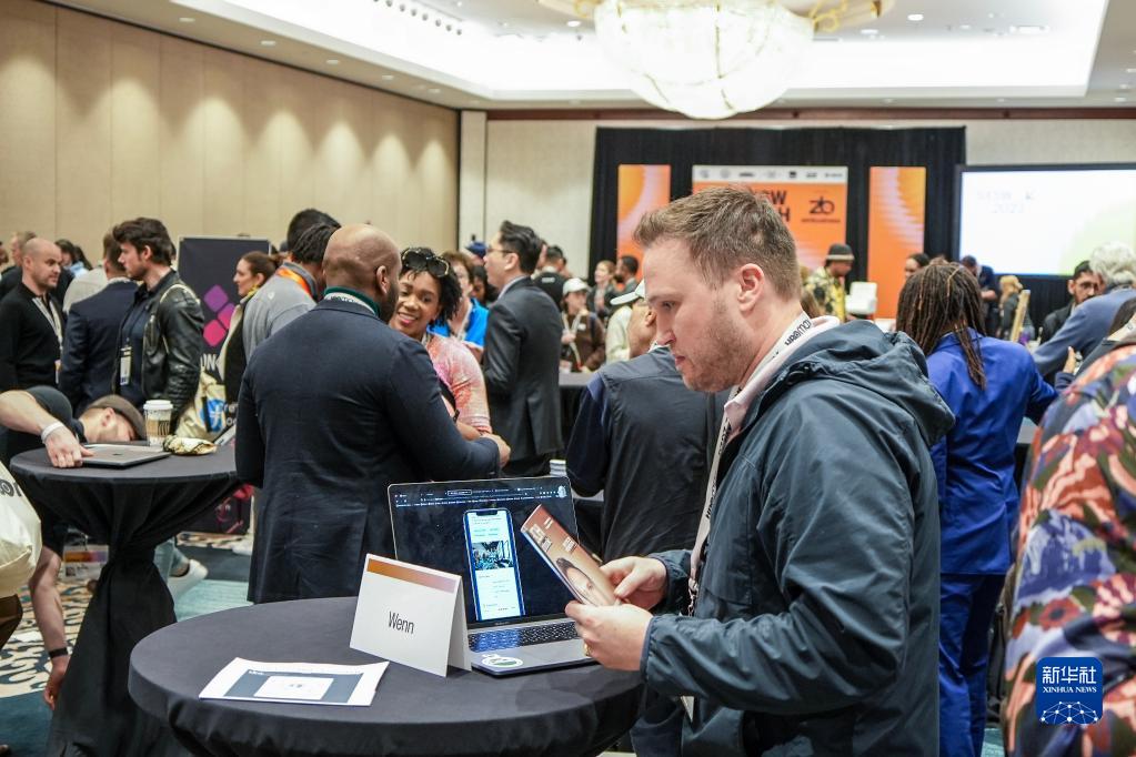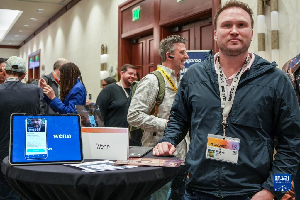 3月13日,在美國得克薩斯州奧斯汀,來自達拉斯的科技初創企業家邁克爾·溫寧(前)參加“西南偏南”大會。新華社發(李波攝)