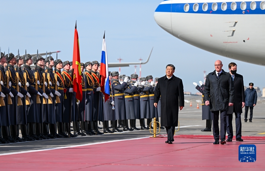 當地時間3月20日,國家主席習近平乘專機抵達莫斯科,應俄羅斯總統普京邀請,對俄羅斯進行國事訪問。下午1時許,習近平乘坐的專機抵達莫斯科伏努科沃專機機場。習近平步出艙門時,俄羅斯副總理切爾內申科等政府高級官員在舷梯旁熱情迎接。俄方在機場舉行隆重迎賓儀式。軍樂團奏中俄兩國國歌。這是習近平檢閱俄羅斯三軍儀仗隊并觀看分列式。新華社記者 謝環馳 攝