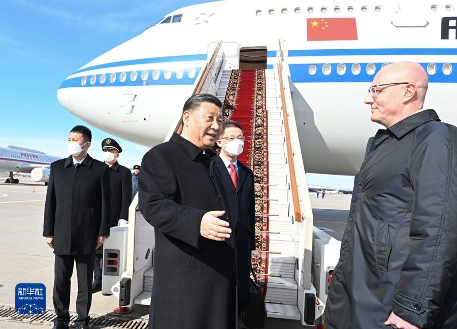 當地時間3月20日,國家主席習近平乘專機抵達莫斯科,應俄羅斯總統普京邀請,對俄羅斯進行國事訪問。下午1時許,習近平乘坐的專機抵達莫斯科伏努科沃專機機場。習近平步出艙門時,俄羅斯副總理切爾內申科等政府高級官員在舷梯旁熱情迎接。新華社記者 謝環馳 攝