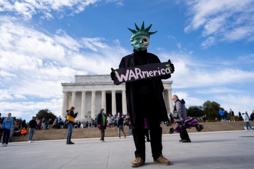 2月19日,在美國首都華盛頓,一名抗議者手舉標語在林肯紀念堂前參加反戰集會。新華社記者劉杰攝
