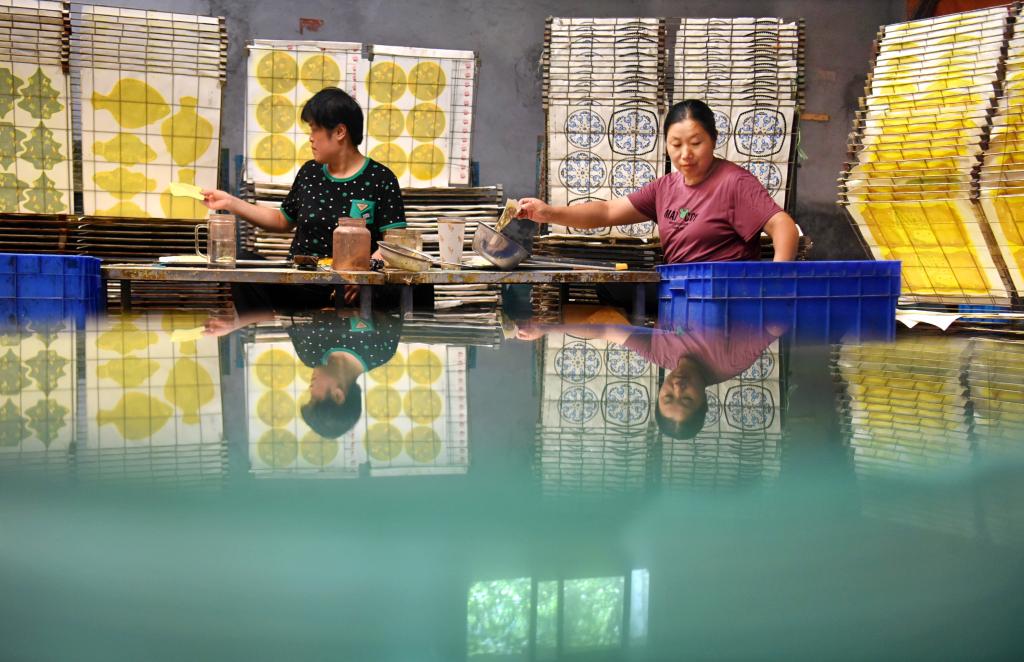 8月15日,在山東省淄博市沂源縣悅莊鎮東埠村一玻璃制品企業,工人對玻璃進行貼畫加工。新華社發(趙東山攝)