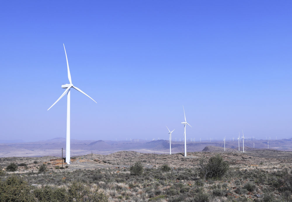 這是在南非北開普省德阿鎮拍攝的德阿風電項目風機(2023年8月10日攝)。由中國龍源電力集團南非公司運營的德阿風電項目每年發電量超過7.5億千瓦時,相當于節約20多萬噸標準煤,減排二氧化碳約70萬噸。