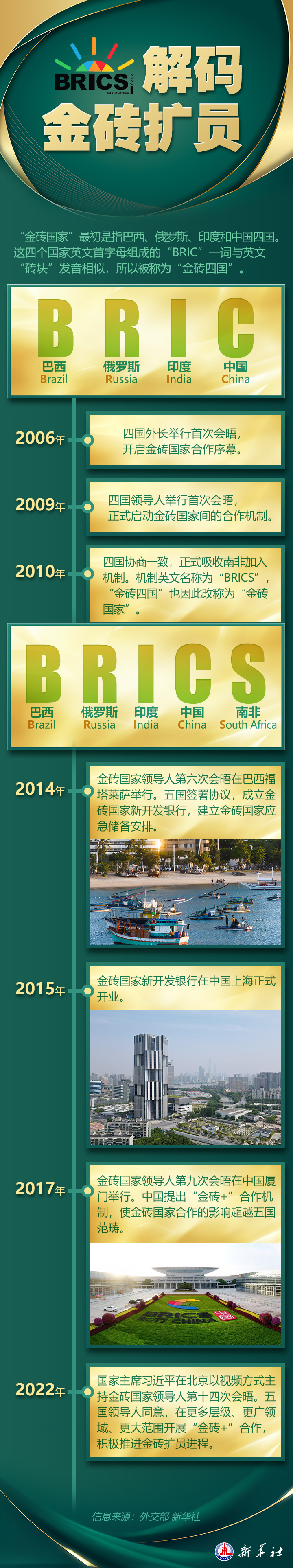 24日,金磚國家領導人第十五次會晤特別記者會宣布,邀請沙特、埃及、阿聯酋、阿根廷、伊朗、埃塞俄比亞正式成為金磚大家庭成員。