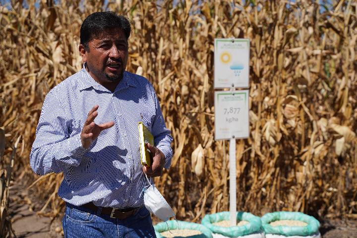2022年11月7日,一位專家在墨西哥特斯科科郊外國際玉米小麥改良中心的試驗田里進行介紹。(新華社記者朱雨博攝)