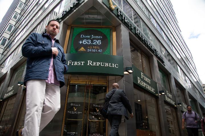 5月1日,在美國紐約,行人從一家第一共和銀行前走過。(新華社發(fā),郭克攝)