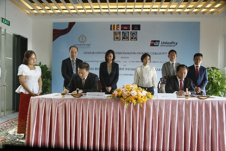 中國銀聯(lián)子公司銀聯(lián)國際與柬埔寨央行7月10日在金邊簽署合作備忘錄,約定推動跨境二維碼業(yè)務(wù)互聯(lián)互通,雙向服務(wù)中柬兩國居民跨境移動支付需求。(新華社發(fā),批隆攝)