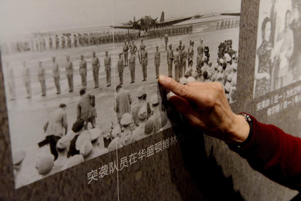 杜立特突襲者子女協會成員在老照片中尋找父輩的身影。(王飛 攝)