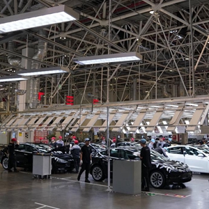 2023年5月12日,在特斯拉上海超級工廠總裝車間,工人對車輛進行檢測。新華社記者馬寧攝
