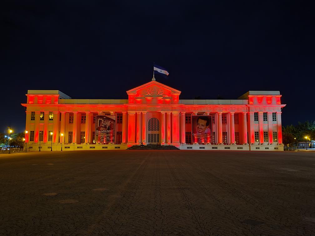 2022年1月31日,尼加拉瓜首都馬那瓜市中心標志性建筑國家宮點亮“中國紅”。新華社發(中國駐尼加拉瓜使館供圖)