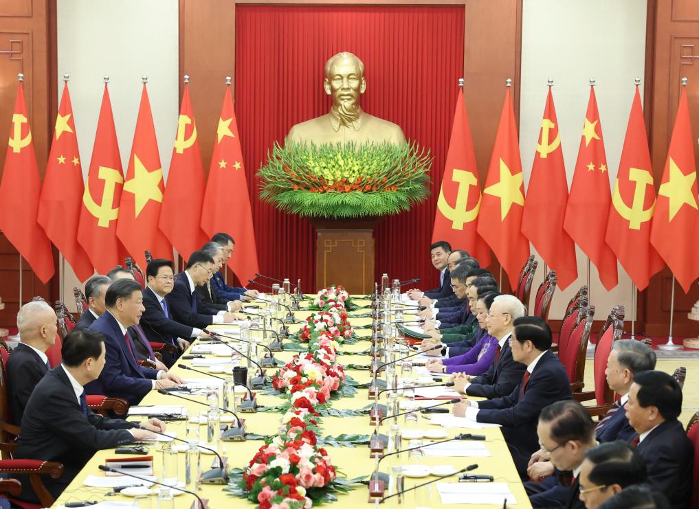 當地時間12月12日下午,剛剛抵達河內的中共中央總書記、國家主席習近平在越共中央駐地同越共中央總書記阮富仲舉行會談。雙方宣布中越兩黨兩國關系新定位,在深化中越全面戰略合作伙伴關系基礎上,攜手構建具有戰略意義的中越命運共同體。