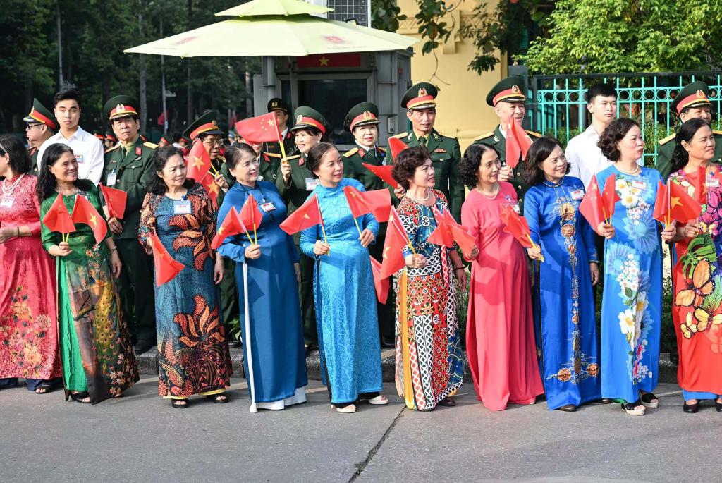 歡迎儀式后,習近平和阮富仲乘車前往越共中央駐地。當地各界群眾揮舞兩國國旗夾道歡迎,沿途洋溢著熱烈友好的氛圍。