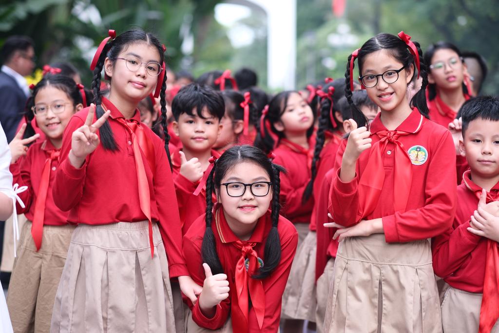 主席府廣場莊嚴熱烈,金星紅旗同五星紅旗相映成輝,數百名歡迎兒童綻放的笑容燦爛明媚。