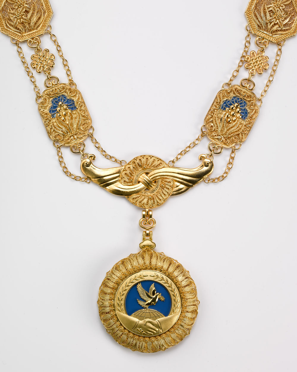 “友谊勋章”章体以金色、蓝色为主色调,采用和平鸽、地球、握手、荷花等元素,章链采用中国结、万年青、牡丹花、玉璧、兰草等元素,整体采用花丝镶嵌、掐丝珐琅等传统工艺手工制作。设计制作象征中国人民同各国人民友好团结、友谊长存,祝愿世界各国共同繁荣发展。