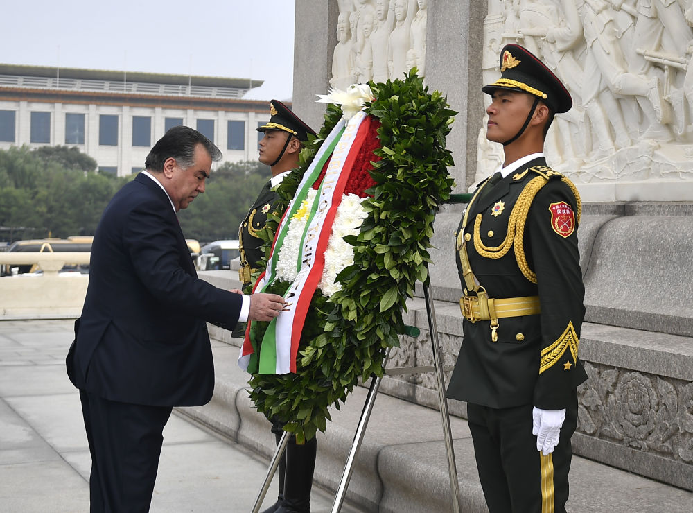 2014年9月13日,国家主席习近平和塔吉克斯坦总统拉赫蒙在杜尚别共同出席中塔两国重大合作项目——杜尚别2号热电厂一期工程竣工仪式、二期工程开工仪式。这是习近平和拉赫蒙一同将装有两国元首签名二期工程奠基纪念页的金色金属管放入水泥墩中。