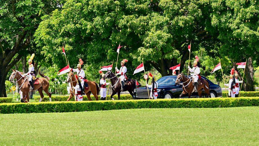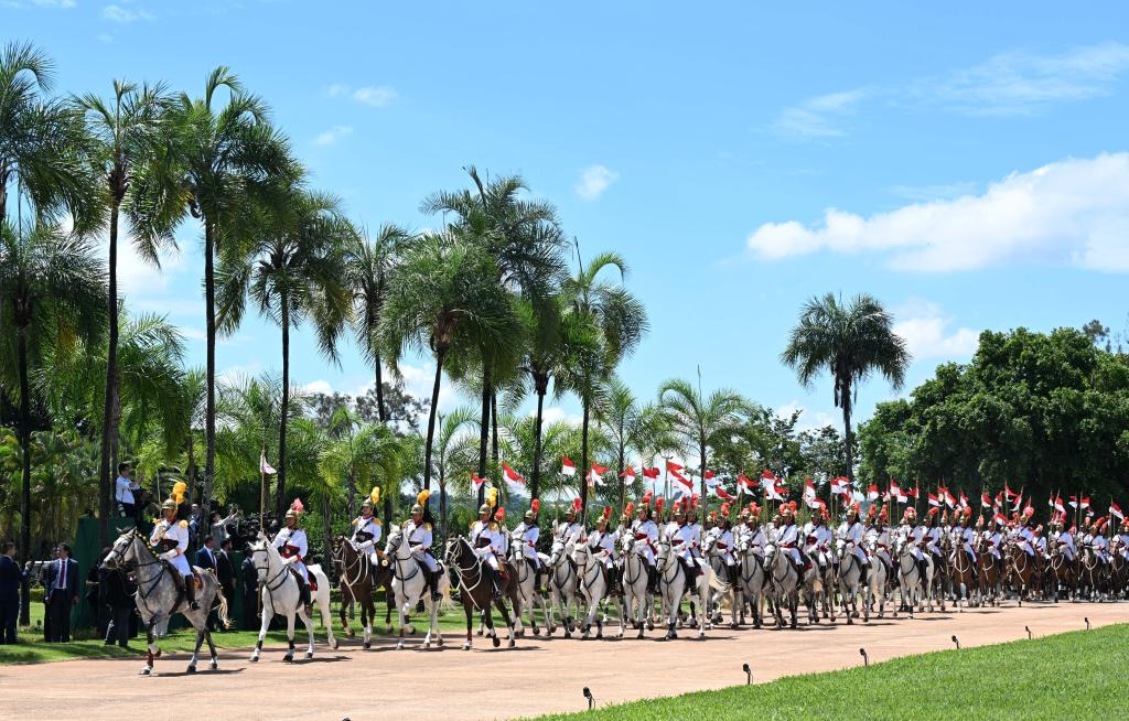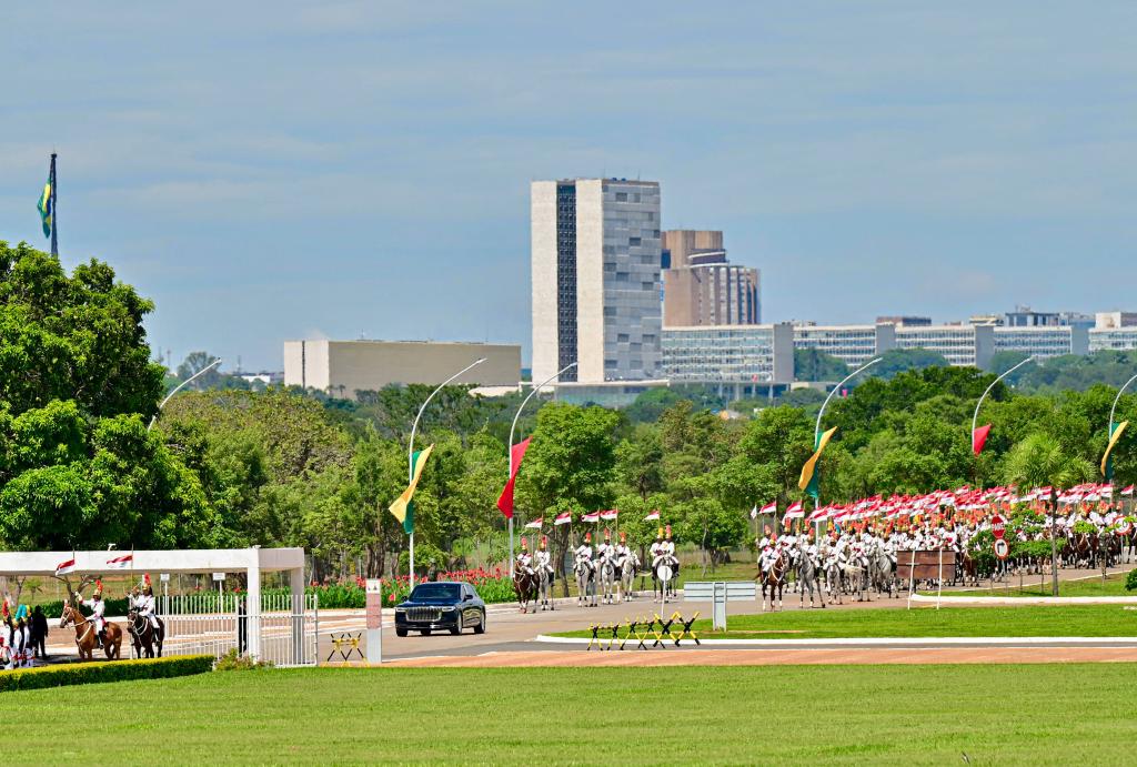 在120名龙骑兵护卫下,习近平主席乘车抵达黎明宫前广场。卢拉总统和夫人罗桑热拉热情迎接习近平主席,并为习近平主席举行隆重盛大欢迎仪式。