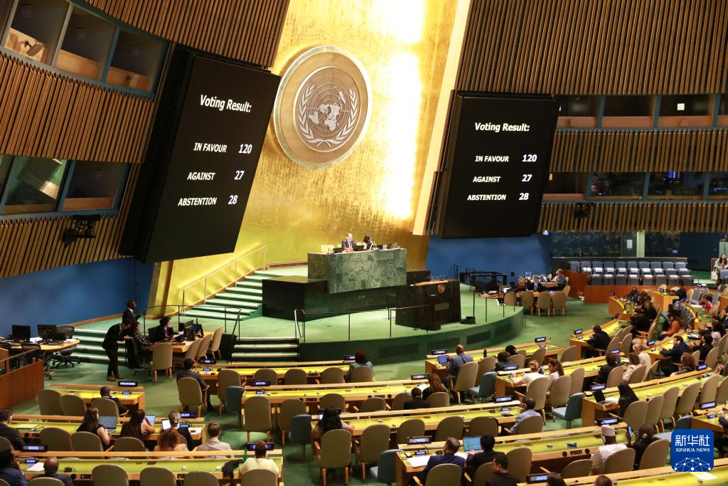 这是9月5日在位于纽约的联合国总部拍摄的显示屏上的投票结果。新华社记者 谢锷 摄
