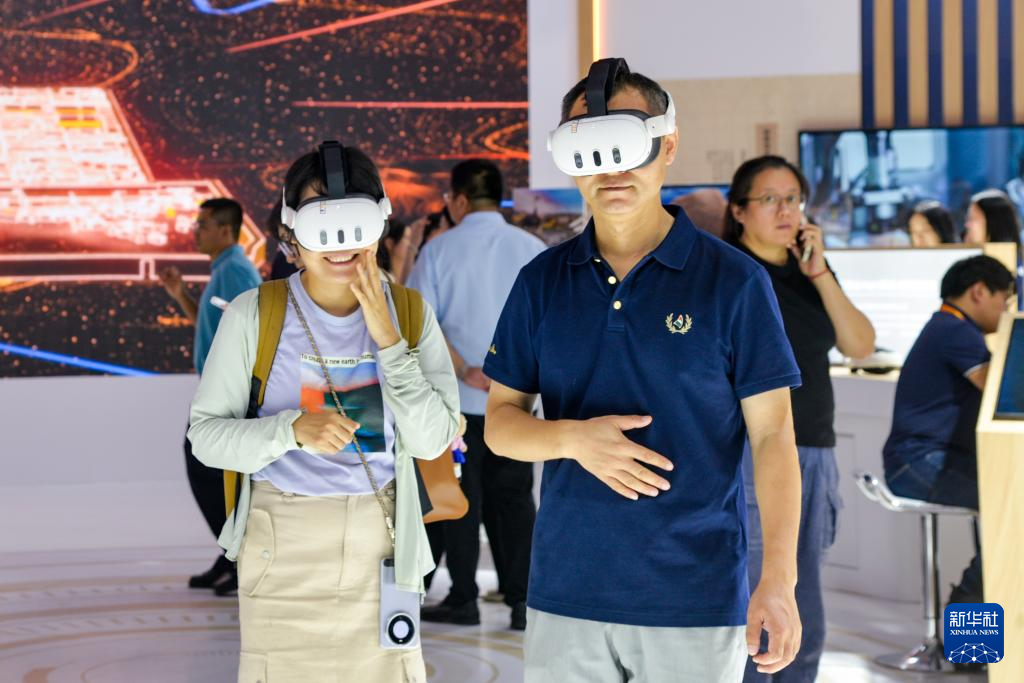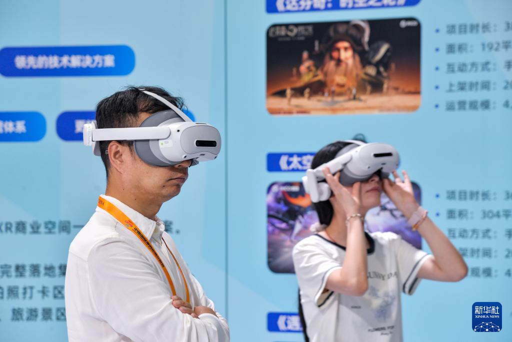 9月12日,在北京首钢园,参展者在2025年服贸会文旅服务展馆北京市广电局展台体验、了解虚拟现实数智化文商旅解决方案。