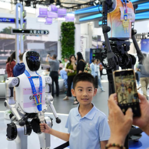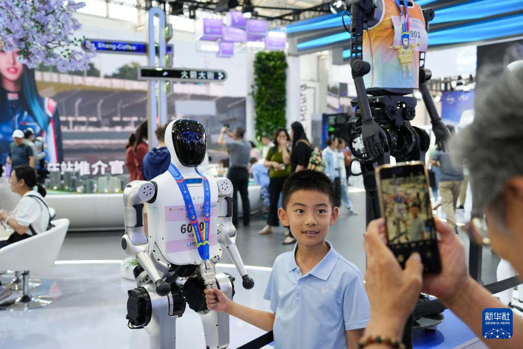 9月13日,在北京首钢园,小朋友在2025年服贸会文旅服务户外展区与AI具身智能机器人“AI小蚂ROBOT”互动。