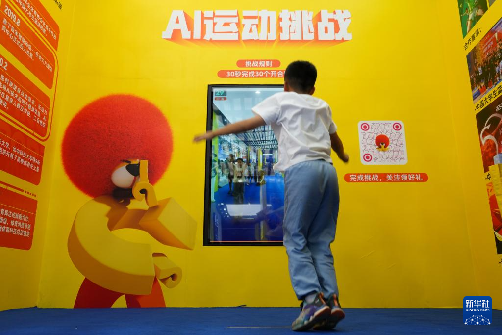 9月13日,在体育服务专题展区橙狮慧影展台,小朋友体验“AI运动挑战”项目。