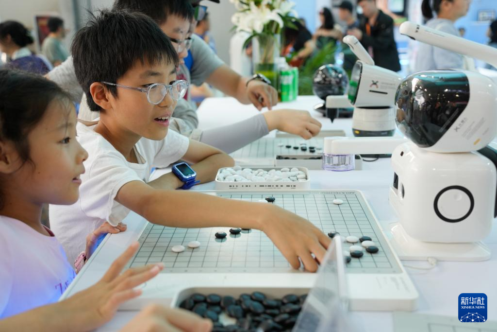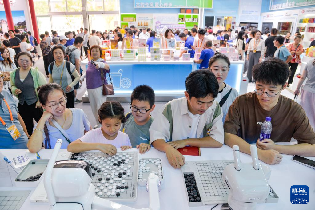9月13日,在文旅服务专题展区经开区展台,小朋友和机器人下五子棋。