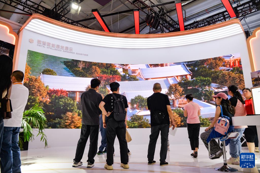 9月13日,在北京首钢园,参展者在2025年服贸会文旅服务展馆北京市文物局展台观看、了解数智赋能展览展示。